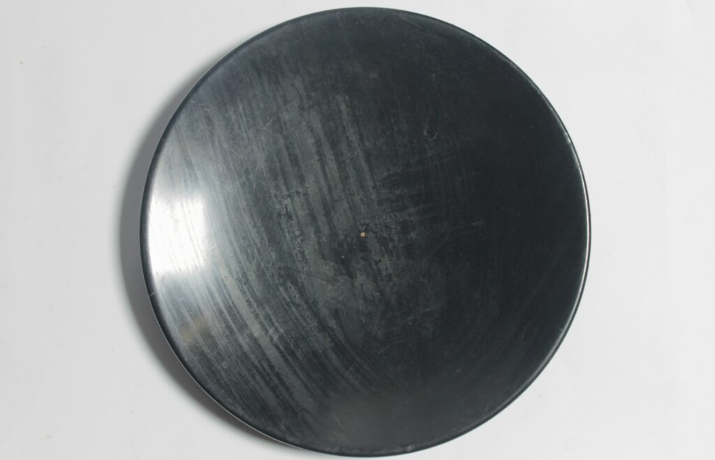Pires de madeira com aplicação de charão. A parte superior é lisa e na cor preta. Na parte posterior, base com acabamento em formato de anel com bordas grossas e depressão ao centro. No fundo, etiqueta com a inscrição "CH-144".